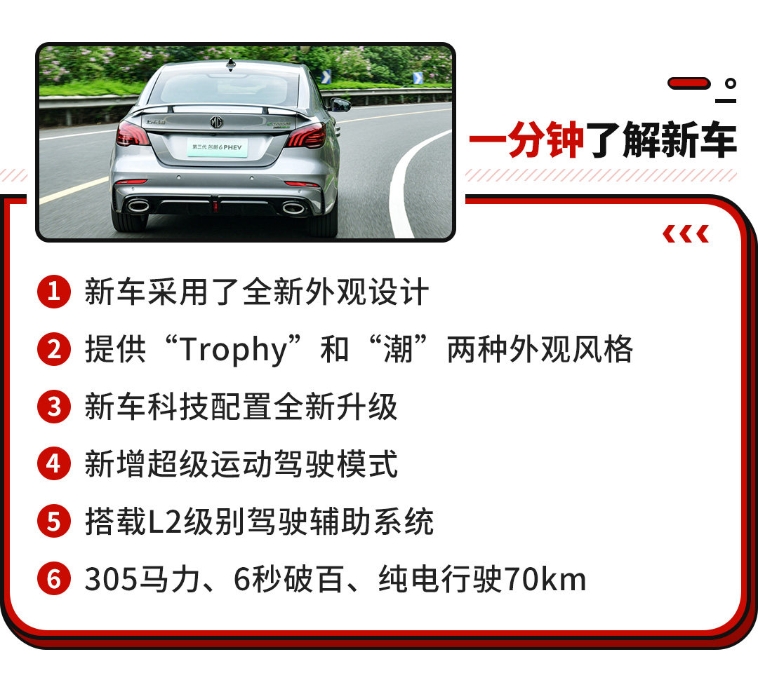 总的来说,新款名爵6 PHEV车型,虽然在售价上有着一定幅度下降,同时从外观内饰的设计,以及各种配置与驾驶辅助,都有了非常全面的改善。虽然相比燃油版车型的定价稍高,但是除了配置提升之外,动力也有较大幅度的升级,并且对于限牌限购城市来说,还不用为指标而烦恼,所以即使与合资品牌作对比也会有一定的优势。
