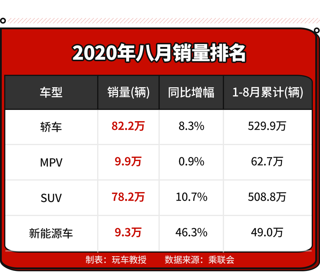 造成这种情况有几个原因:其一,近年来SUV是市场宠儿,也是消费者购车偏好,各大厂商都在全力发展SUV市场,轿车市场基本是属于“吃老本”状态;其二,随着前几个月的恢复,商家们逐渐恢复了正常的生产生活,对于MPV的需求已经在前几个月几乎消化完毕,目前的MPV基本以个人用户为主。其三,五菱宏光MINI EV上市即获9000余辆的成绩,在今年剩余几个月成为继Model 3之后另一新能源销量担当不成问题。