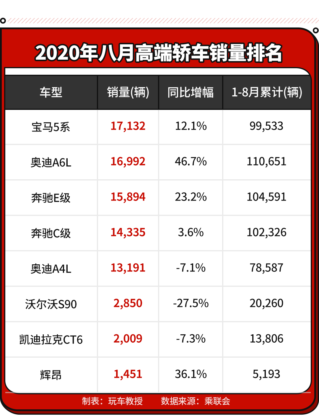 在高端轿车领域,BBA三员大将依旧傲视群雄,宝马5系、奥迪A6L、奔驰E级依旧称霸前三,随后就是奔驰C级、奥迪A4L。整个销量榜的排行跟上个月相比基本一致,A4L以下的豪华品牌车辆,基本每个月只有3000辆以下的表现。整体来看,高端轿车的增长速度放缓,就连上个月同比增长71.5%的奥迪A6L,在8月份也只有46.7%。