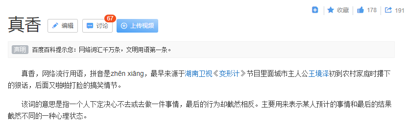 当年的真香定律有多火?火到百度专门将其录入百科之中,并为其亲自注解。那么为什么真香定律可以这么火?一来当然是因为综艺节目自带的娱乐属性,二来真香其实不是一个段子,都是生活真实的写照,戳中了很多人下定决心不去或去做一件事情,最后的行为却截然相反的心理现实。