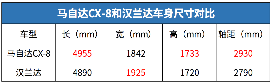 作为7座SUV,CX-8的车长接近5米,轴距超过2.9米,和汉兰达相比,除了车宽外,其他方面可谓全方位超越。
