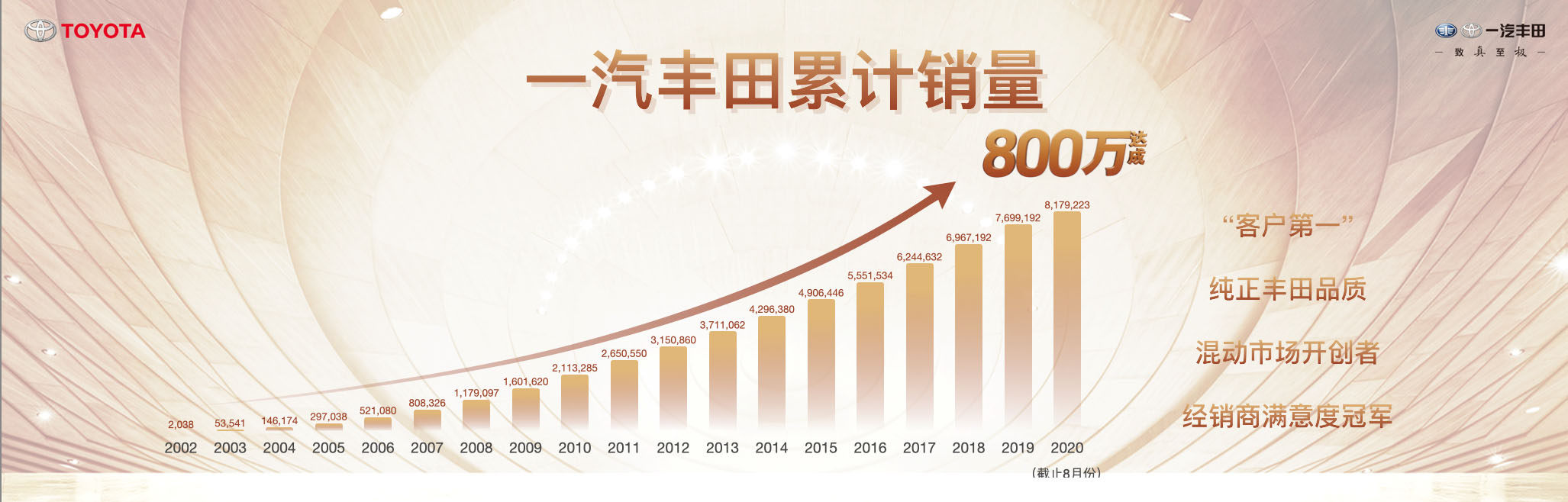 800万销量达成,是属于一汽丰田的勋章,但同时也是一汽丰田给出的800万份承诺与责任,站在800万的新起点,一汽丰田将为满足用户对美好生活的向往而不断前行,面对年产销百万级和千万级用户的体量,一汽丰田已经做好了准备。