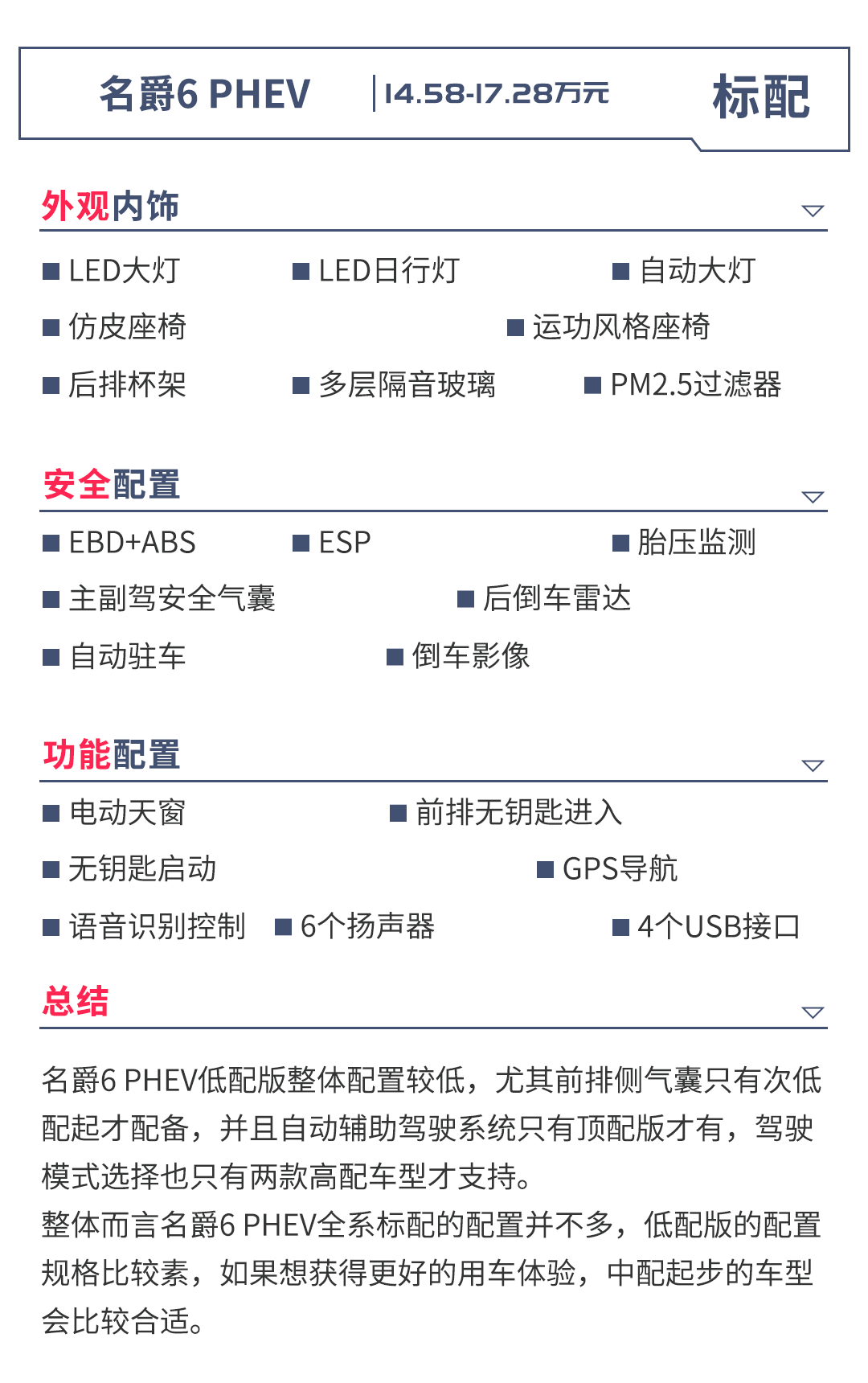 基础实用性配置在第三代名爵6 PHEV中已经都有配备,像是LED自动大灯、皮质方向盘等都是全系标配,只不过像主动安全等配置都被放到了顶配车型上,但鉴于定价还算亲民的因素,这点也可以理解。