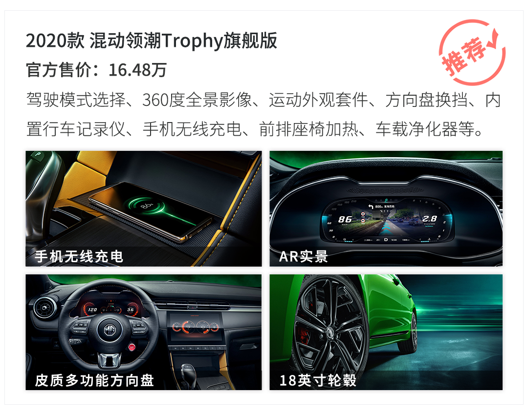 Trophy旗舰版虽然并未配备L2.5级的自动辅助驾驶系统,但是拥有运动外观套件和多种驾驶模式选择的它更能让名爵6 PHEV的运动特性被发挥出来,尤其像AR实景和手机无线充电等功能的实用性很高,能够带来更加便利和安全的用车体验。
