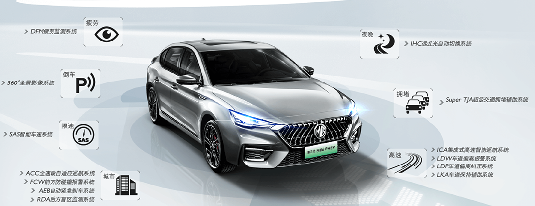在自动辅助驾驶方面,第三代名爵6 PHEV搭载了L2.5级的MG PILOT 2.0驾驶辅助系统,全车配备了3个毫米波雷达、4个超声波雷达和6个摄像头,支持13项辅助驾驶功能。