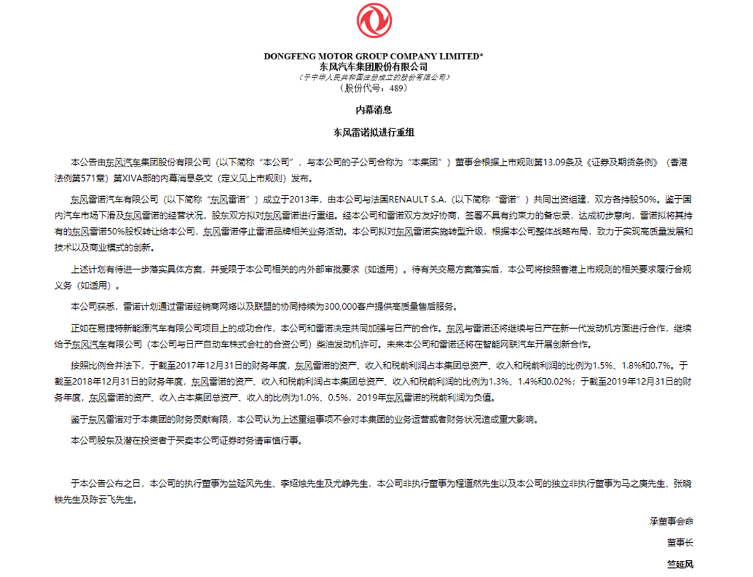 9月,东风雷诺汽车有限公司的工商注册信息已经正式变更为“东风汽车(武汉)有限公司”,2020年4月份,东风汽车集团股份有限公司在港交所发布了公告,东风汽车集团将对东风雷诺进行重组,理由是中国汽车市场的下滑以及东风雷诺经营不良,双方将签署不具备约束力的备忘录,并已经达成意向。
