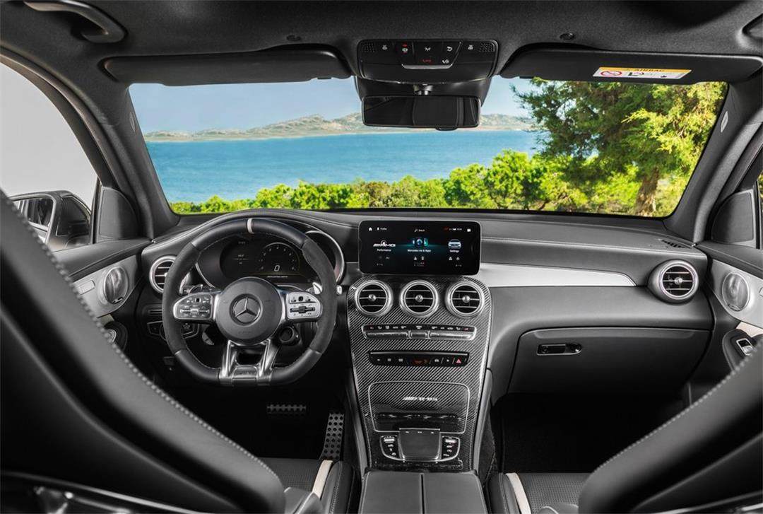 新车大体设计上还是沿用了现款GLC的设计,而为了彰显其性能车的定位,一套极具攻击性的AMG套件还是给车辆增加了不少外观方面的看点;同时无论是外观还是内饰, GLC 63都采用了大量碳纤维材料,用于进一步强化车辆运动属性与表现。
