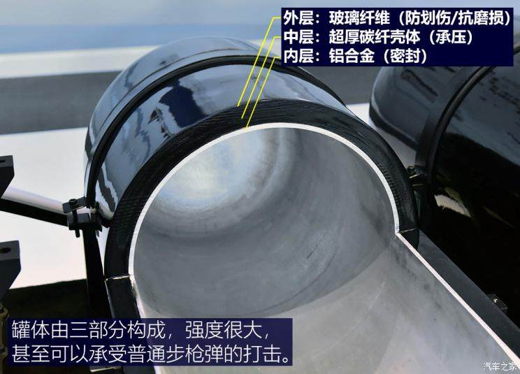 车企对安全非常看重,这么长时间也是在测试氢燃料电池的安全性,以上汽为例,EUNIQ 7三个罐子可承受的最大压力为70兆帕,与丰田Mirai的气罐压力相近。罐体由三层材料构成,抗压抗穿刺能力很强,中置布局也尽可能避免了气罐在事故中遭受挤压。