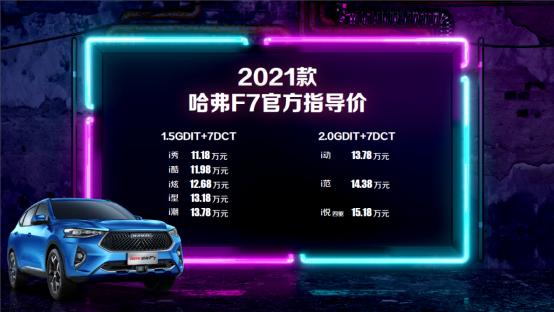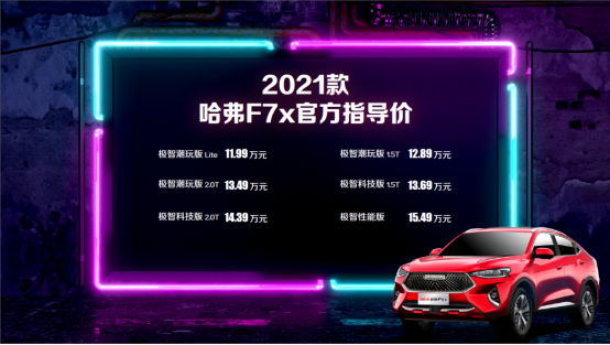 作为哈弗F系为全球年轻用户打造的焕新之作,2021款哈弗F7共发布包括i秀、i酷以及i潮等8个版本,厂商指导价区间为11.18万元——15.18万元;2021款哈弗F7x上市发布共计6个版本,厂商指导价区间为11.99万元——15.49万元。为让更多用户共享出行智慧生活,2021款哈弗F7/F7x同步通过“五大上新”以及“Fun-Life 2.0系统”和“12.3寸中控显示大屏”两大全系标配,实现智能化再进阶。