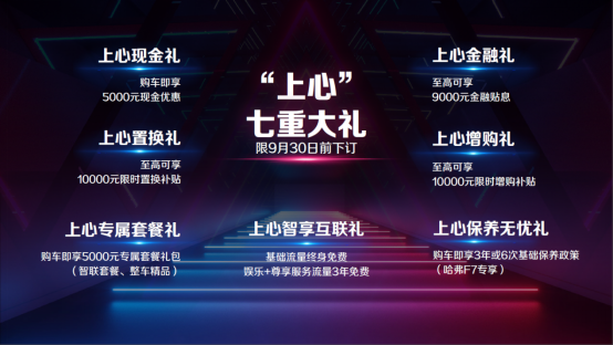 惊喜远不止于此,即刻起,在9月底之前购买2021款哈弗F7/F7x还可享有限时“上心七重大礼”。用户购车即享5000元现金优惠的上心现金礼,贷款或置换增购则可分别享受至高9000元金融贴息的上心金融礼、至高10000元的限时置换补贴和限时增购补贴。同时,更有上心专属套餐礼、上心智享互联礼限时奉送,用户购买2021款哈弗F7同步更可享受上心保养无忧礼,即购车立享3年或6次基础保养政策。
