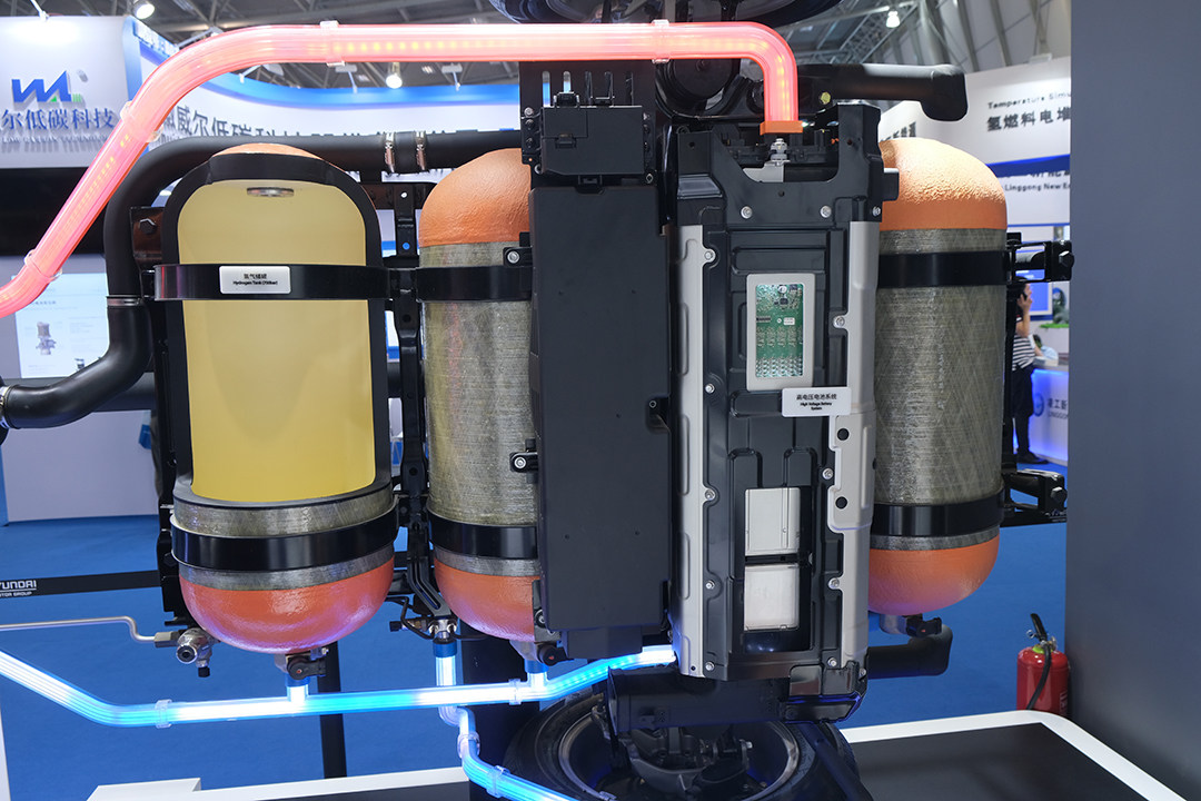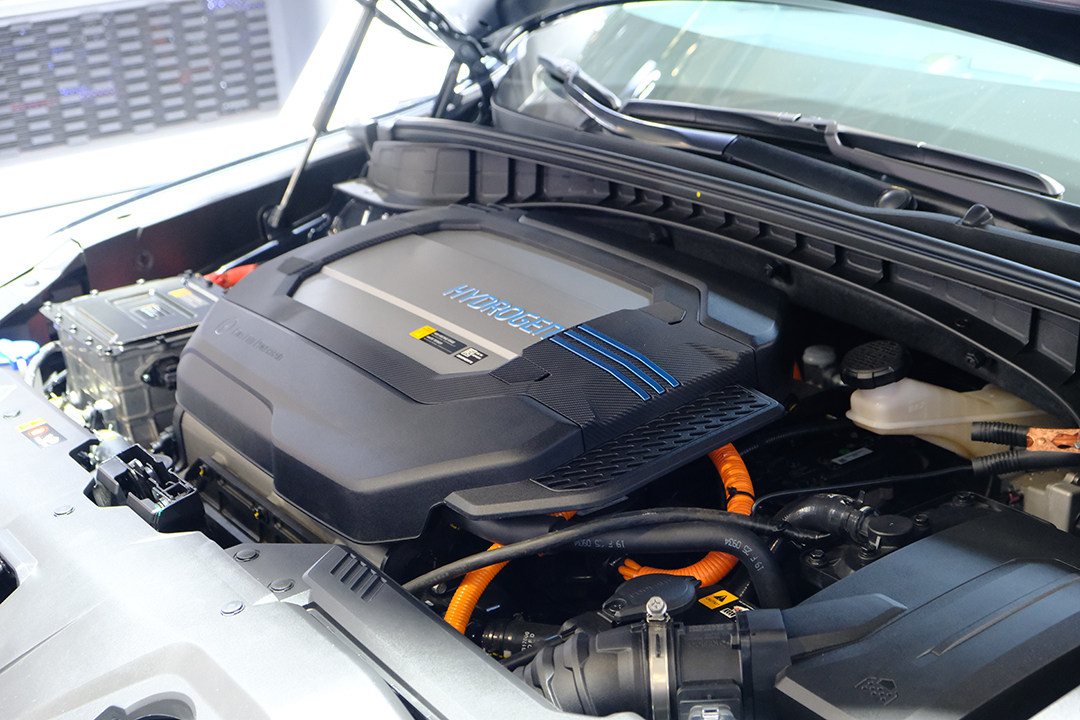 它后部搭载了三个储氢罐,氢气通过管道传输到车头的燃料电池堆,再与空气中的氧气产生化学反应,进而产生电能,电能随即驱动燃料电池堆下的电动机,至于多余以及回收的能量则存储在后方的锂电池组。简单来说,它就像是无需充电的电动车,依靠氢气产生电能,这同时结合了燃油车以及电动车的优势。