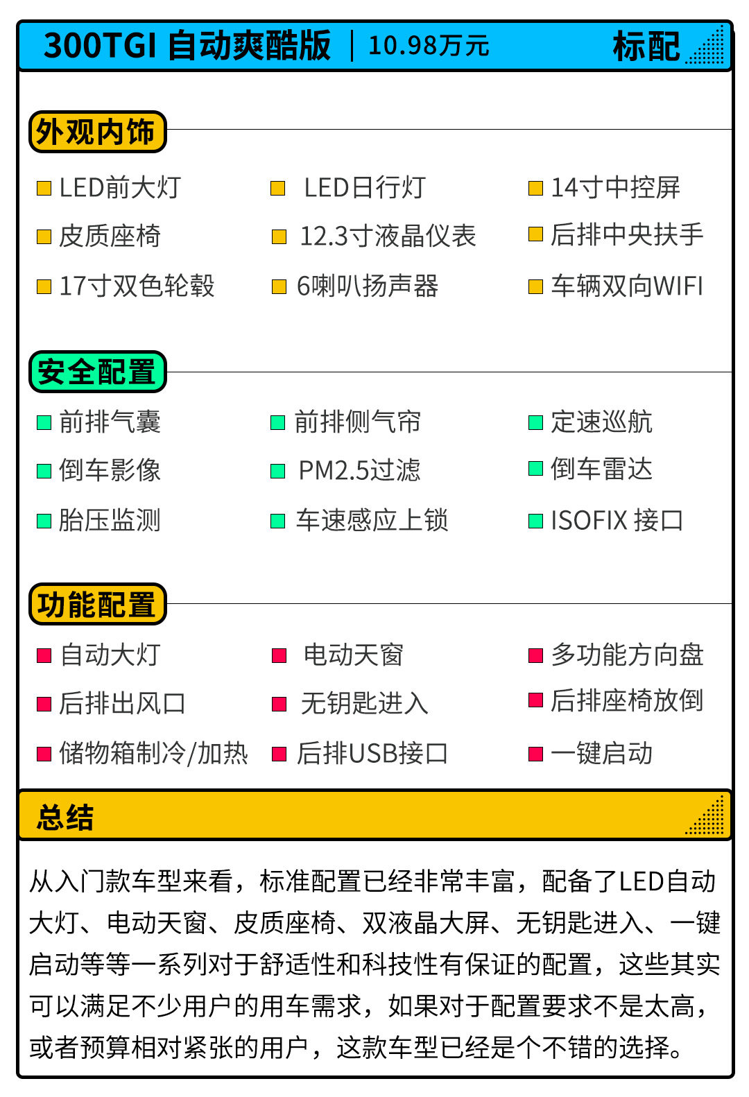从配置表来看,入门款车型已经标配了丰富的配置,对于用户来说这已经能满足大部分的日常使用,不过在一些便利性和科技性配置上,表现还是会显得略微欠缺。