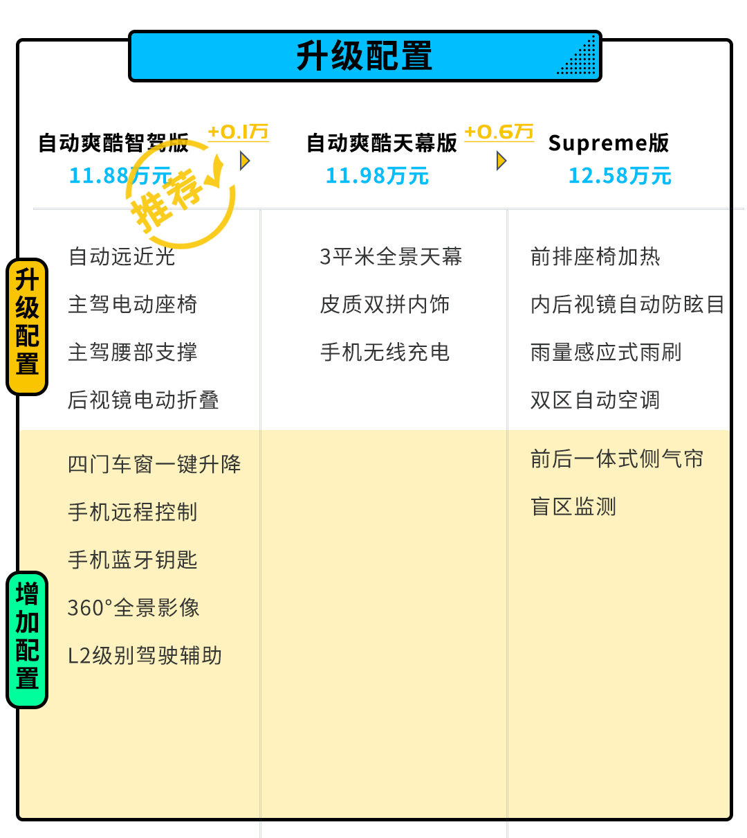 当然你想都要也可以,多加6000元你就能购买全系的顶配车型,你不但可以获得前两款车型所拥有的配置,还会额外增加一些舒适性配置,对于预算充足的用户还是可以考虑一下的。