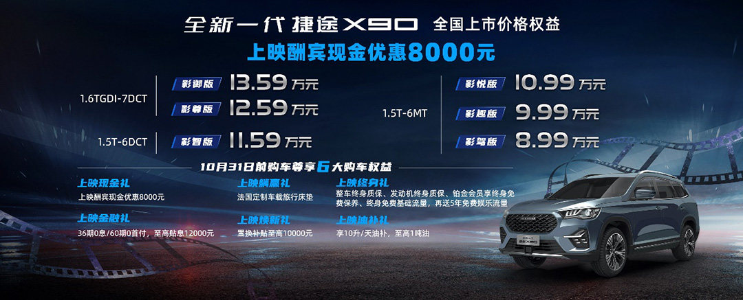 上市当晚,全新一代捷途X90还为消费者准备了一大波购车权益:购车享受现金优惠8000元;享10升/天油补,最高1吨油;法国定制车载旅行床垫。除此之外,还有整车终身质保、发动机终身质保、铂金会员享终身免费保养、终身免基础流量,还送5年免费娱乐流量。而关于购车金融方面,有36期0息/60期0首付,至高贴息12000元 ,还有最高1万元置换补贴。