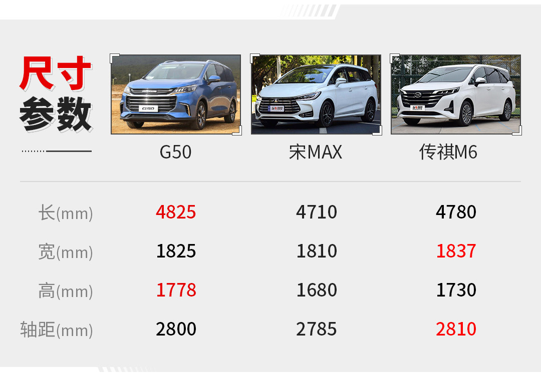上汽大通MAXUS G50的长度是4825mm,轴距也达到了2.8米,同价位你基本找不到比它更大尺寸的MPV,比亚迪宋MAX的车长也才4710mm,而即便传祺M6的车长也没有4.8米,尺寸G50就有很大优势。