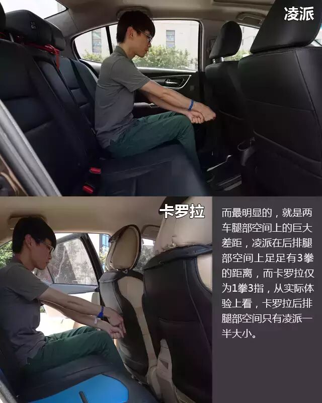 而令教授震惊的是,凌派的后排腿部空间竟然可以媲美中级车,毫不夸张地说,后排腿部空间到达三拳的距离,这样的表现完全不亚于K4、名图等入门级的中级车水平,这点我相当满意。而卡罗拉的后排腿部只有一拳出头,差距甚大。老实说,还是凌派懂中国消费者的购车需求。毕竟,花一样的钱,谁不希望买辆大一点的车呢?