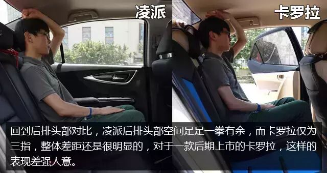 后排空间对比头部空间,凌派无疑比卡罗拉更加出色,要知道,凌派的头部空间一拳还有富余,与同级别竞争对手相比也占据绝对的优势,而卡罗拉仅为三指的头部空间,相比起目前主流的紧凑型轿车,也仅仅是中等水平,这点表现其实难以令人满意、毕竟卡罗拉是后期推出的产品,在空间上却没有任何优势,对喜欢大空间的中国消费者来说,这点确实不讨好。