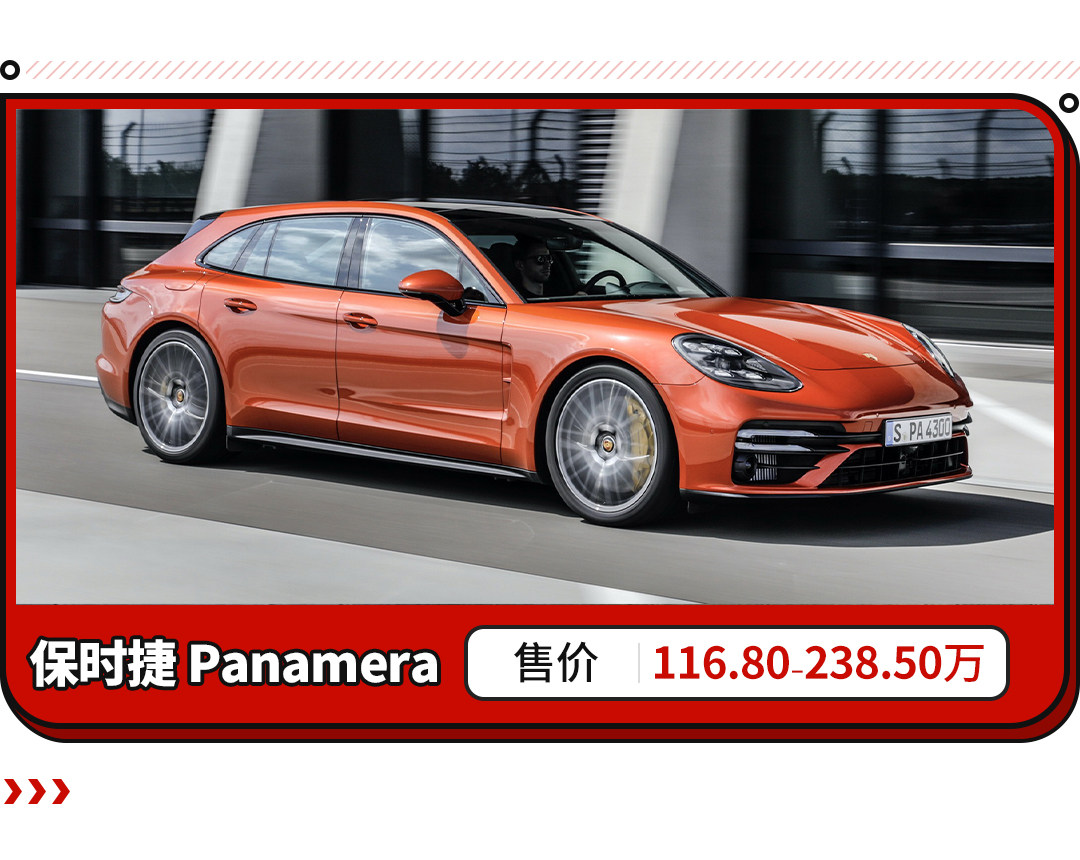 与奔驰一样来自德国的著名跑车制造商保时捷,他们也为旗下五门轿跑Panamera系列推出了猎装车版本:Panamera Sport Turismo。不过由于Panamera本就是一款五门掀背车型,因此Panamera Sport Turismo在外观设计方面与普通版车型并不存在非常明显的差异,只是其车顶线条较普通版更为平直,且尾窗倾斜角度更小,形成一个更明显的“两厢车”形象。