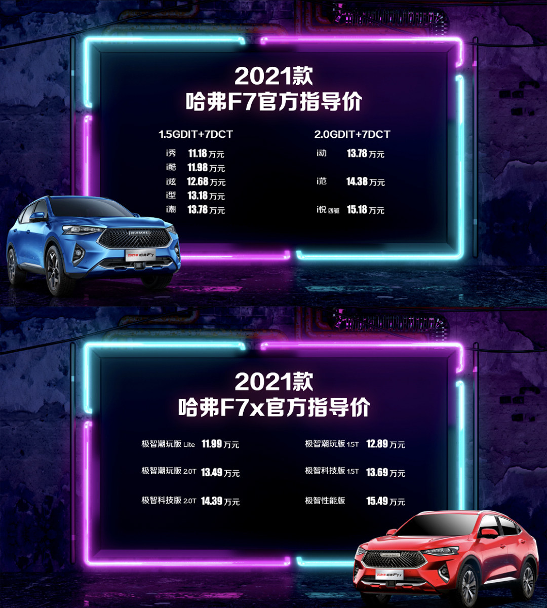 近日,2021款哈弗F7和哈弗F7x正式上市,新车分别推出了8款和6款配置车型,官方指导售价区间分别为11.18-15.18万元和11.99-15.49万元。