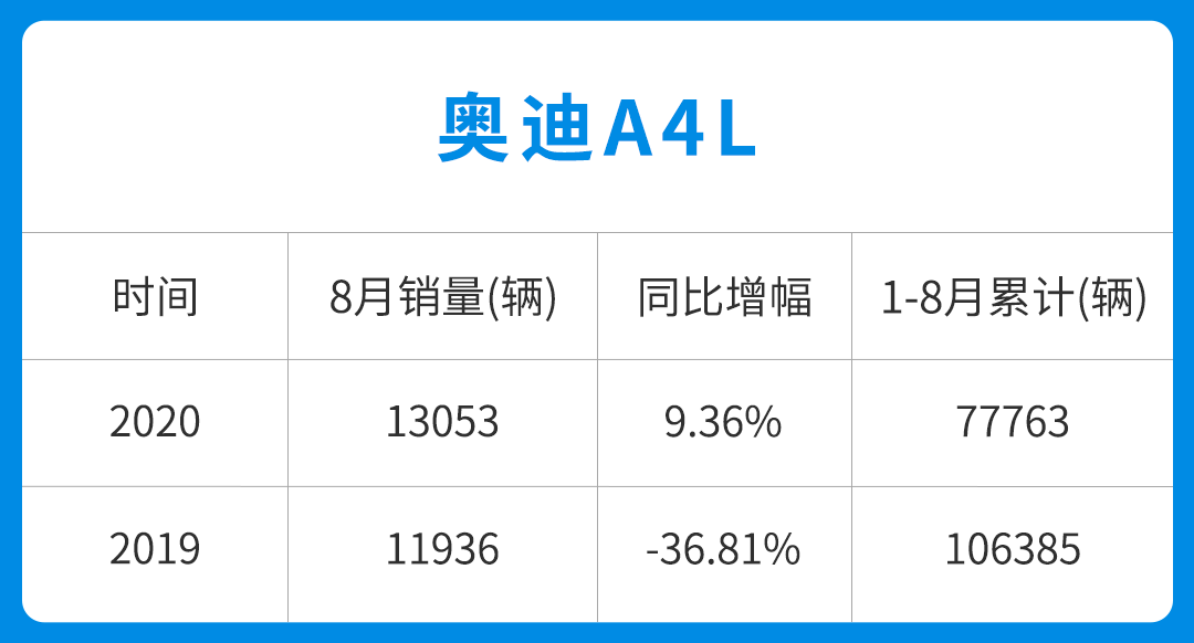尽管奥迪没有宝马那么运动,奔驰那么豪华,但依托着超高的性价比,销量也是节节上升,今年8月销售13053辆,1-8月累计销量77763辆,虽然没有19年那么风光,但是能在车市严寒以及疫情的冲击下,取得如此销量实属不易了,在同级别车型中也仅次于奔驰宝马。