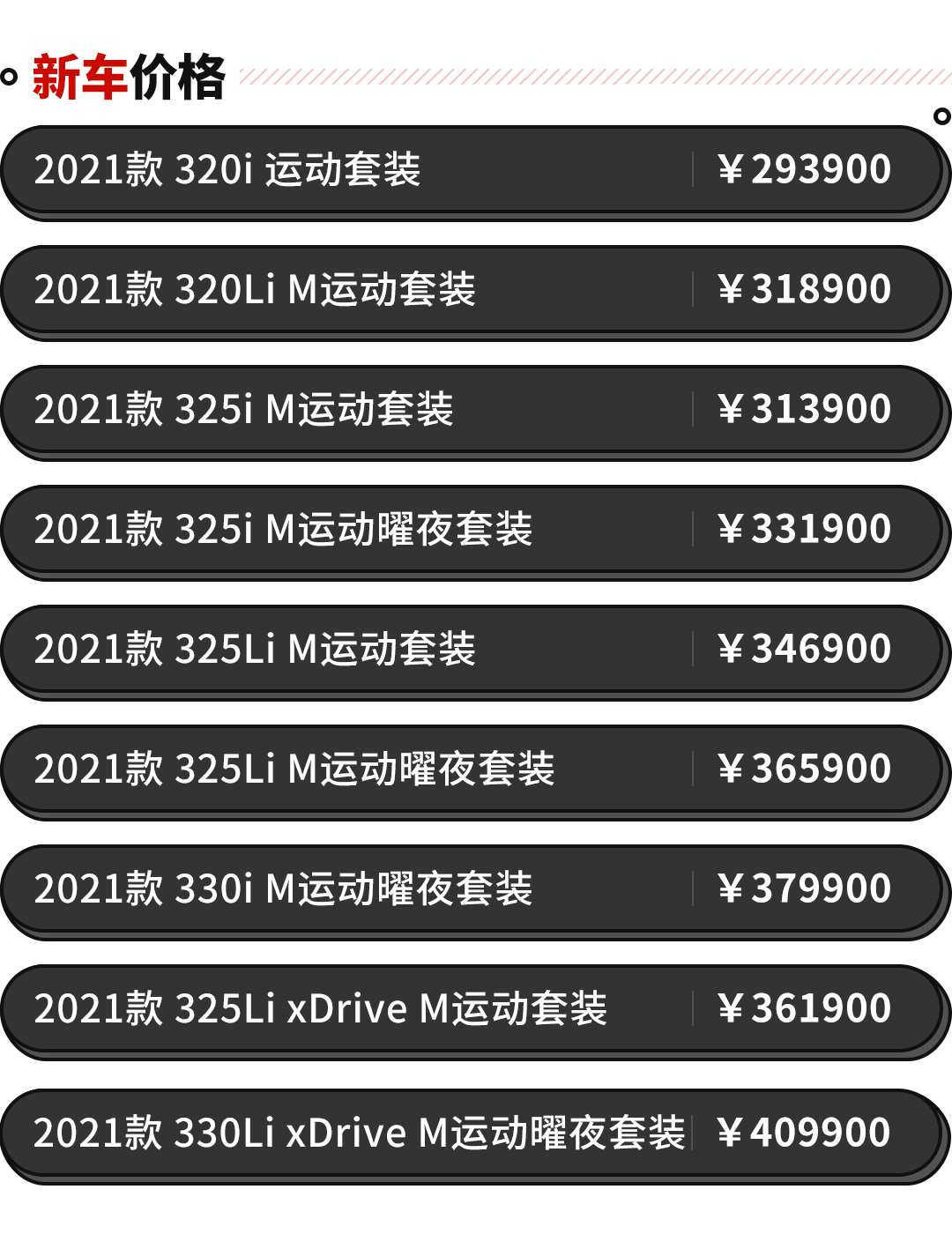 售价低不代表配置少,拿最新款的320i运动套装对比325i M运动套装,325i就比320i多了28马力和50牛米,以及主打刹车、运动外观套件、无钥匙进入和氛围灯,还多了两万块钱,别小看这两万,有时候就是你心头之恨,只有买过车才会理解。我们经常性会看到网上一些键盘侠说:你怎么买了个3系低配,你买顶配3系不如不加点钱买5系?这些基本都是没买过车的。