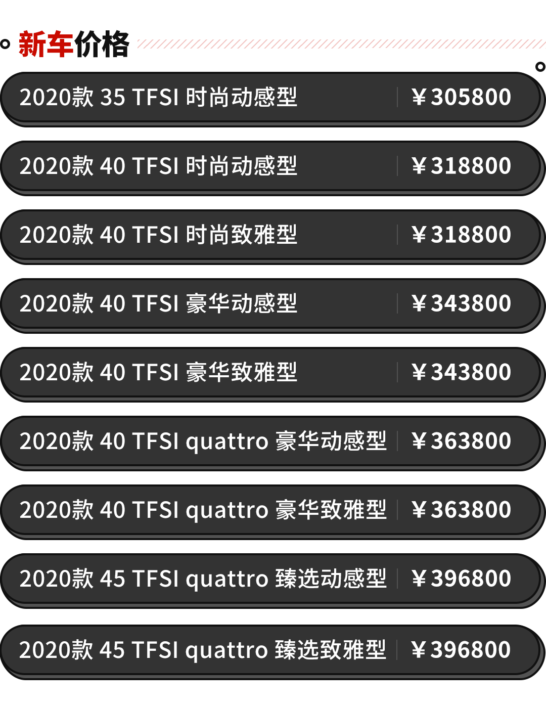 中期改款后的奥迪A4L,吐槽质疑的声音也有了那么一点点,入门级别指导价为30.58万,涨价了一点点,但是在终端优惠上还是给了回来,厂家可能小赚,但我们永远不亏。简单对比下配置价格,拿35TFSI时尚动感对比40TFSI时尚动感,除了少40匹马力和50牛米,还有18英寸的轮毂,其它一样不少,指导价便宜了1.3万,到底值不值得看个人需求了,反正买买君觉得挺划算的。