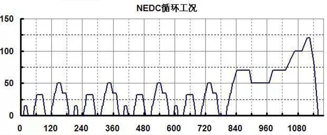 NEDC测试包括两种工况,分别城市工况和市郊工况,前者测试中最高车速50km/h,平均车速19km/h,后者最高速度120km/h,平均车速63km/h。一个NEDC循环由4个市区工况加上1个市郊工况组成,整个NEDC循环总长约11km。