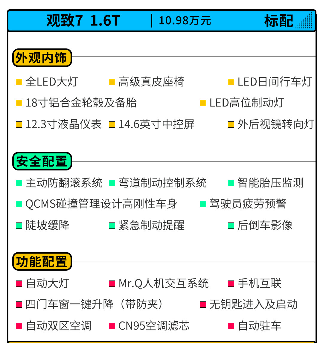 1.6T车型是观致7的主推车型,性价比也是很高。1.6T车型就以配备紧急刹车提示,全液晶仪表和中控大屏,疲劳驾驶预警,还有无钥匙进入和启动等科技配置,用最实惠的价格,给到越级的享受。