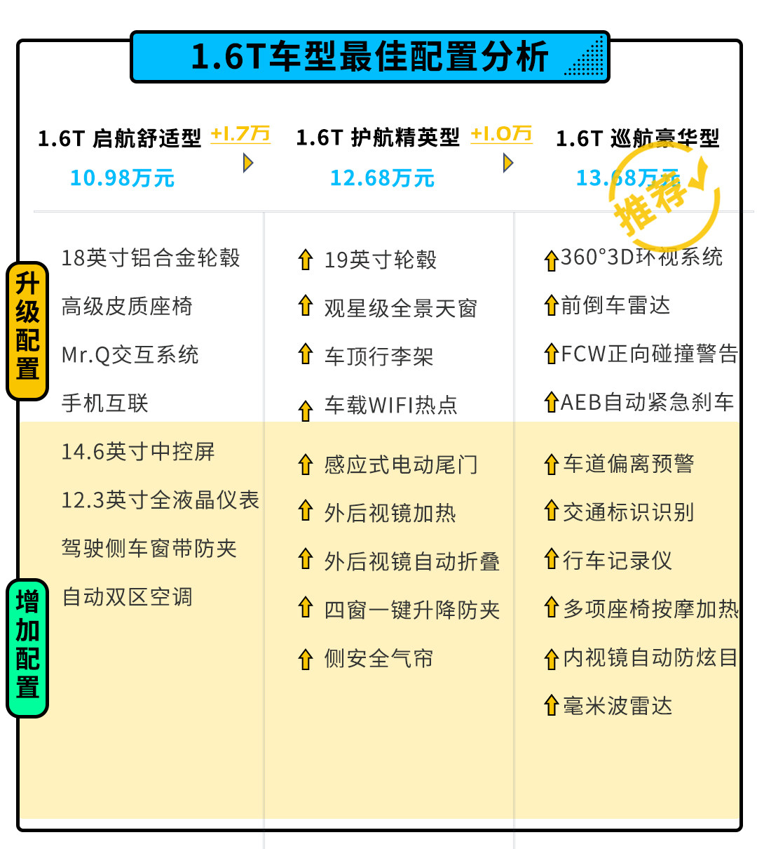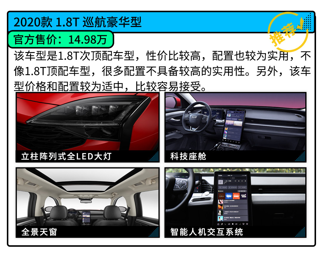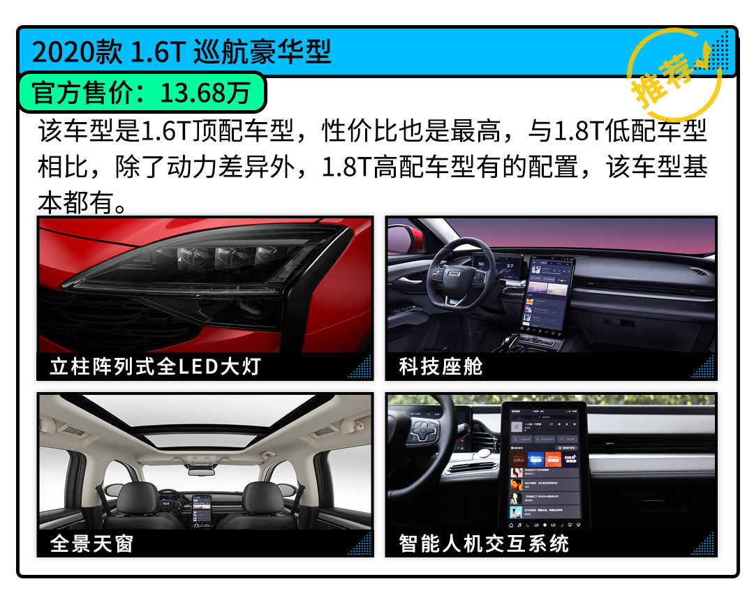 1.6T车型买买君推荐2020款 1.6T 巡航豪华型,因为该款车型不管在配置上还是在价格上都极具性价比,除了动力系统有差异外,该款车型配置直逼1.8T高配车型,这个价位该有的配置和性价比,都能给到你。
