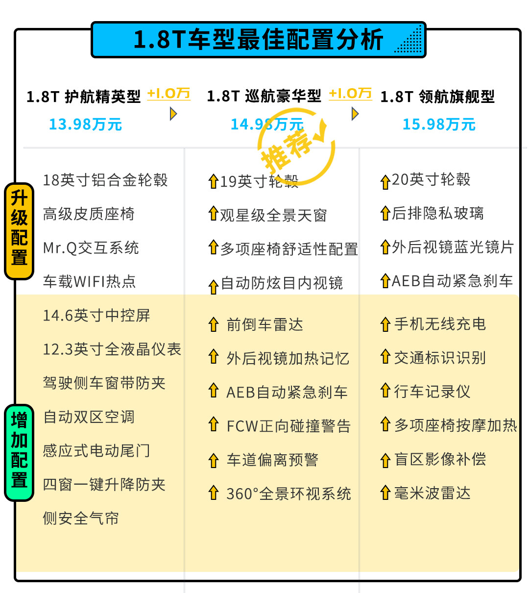 对于1.8T车型的推荐,买买君更倾向于选择1.8T车型的中配车型,因为价格还可接受,配置,动力等硬件也不差,性价比反而更高。