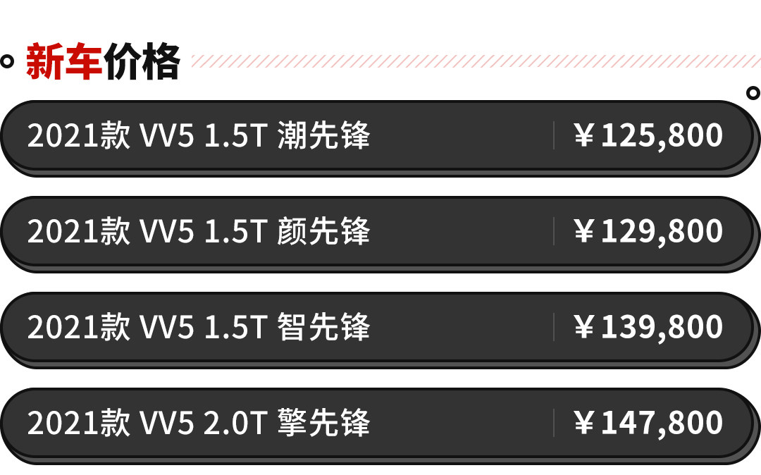 而近日上市的这辆车,其品牌更是代表了长城汽车的高度——WEY,而VV5是WEY品牌中的“小弟”、最入门的一款车,所以在定价上会比VV7等定位会更低,自然价格会更加宜人些。