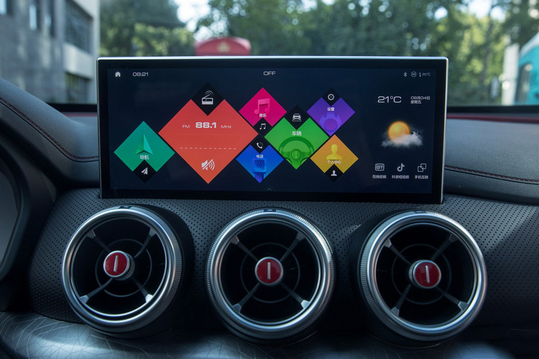 同为12.3英寸的中央多媒体系统触控屏使用窄边框设计,该系统自带多种在线功能,除了在线音乐以外,还有在线导航、在线视频等,并内置爱奇艺APP,可以与手机同步。