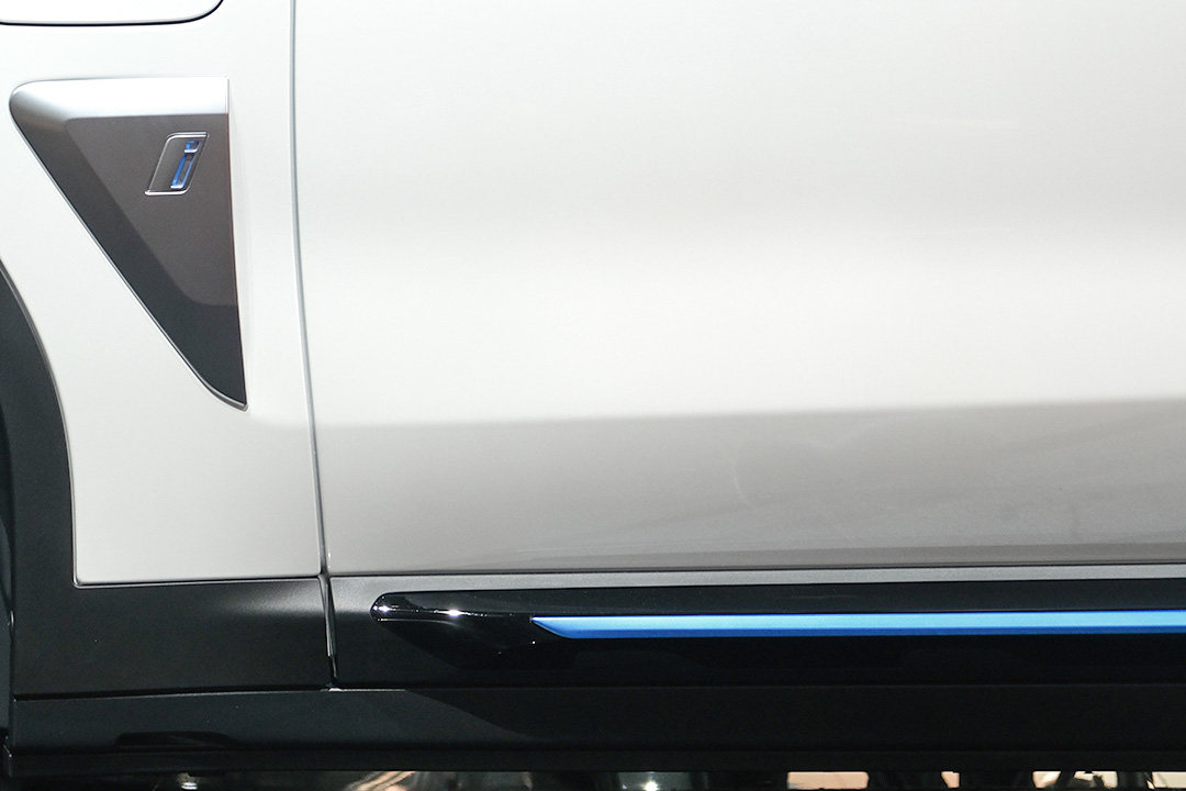来到车侧,可以发现iX3保留了X3车型的风格,悬浮式车顶加上尺寸硕大的空气动力学轮毂,增添了几分运动韵味。保留传统门把手的同时在车门下方引入一条贯穿式前后门板的蓝色饰板,以此凸显它的特殊身份。