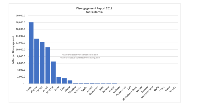 首先我们来看看由美国加州车辆管理局(DMV)提交的2019年自动驾驶汽车脱离报告,(注:脱离是指车辆在自动驾驶过程中,遇到紧急情况,需要安全驾驶员进行干预的情况)。