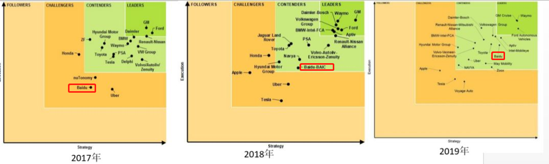 我们从这四年的趋势来看,百度自动驾驶技术的进步有目共睹,从2017年的第三梯队,逐年上升到2020年的第一梯队,和Waymo、Cruise、Ford一道成为行业领导者。