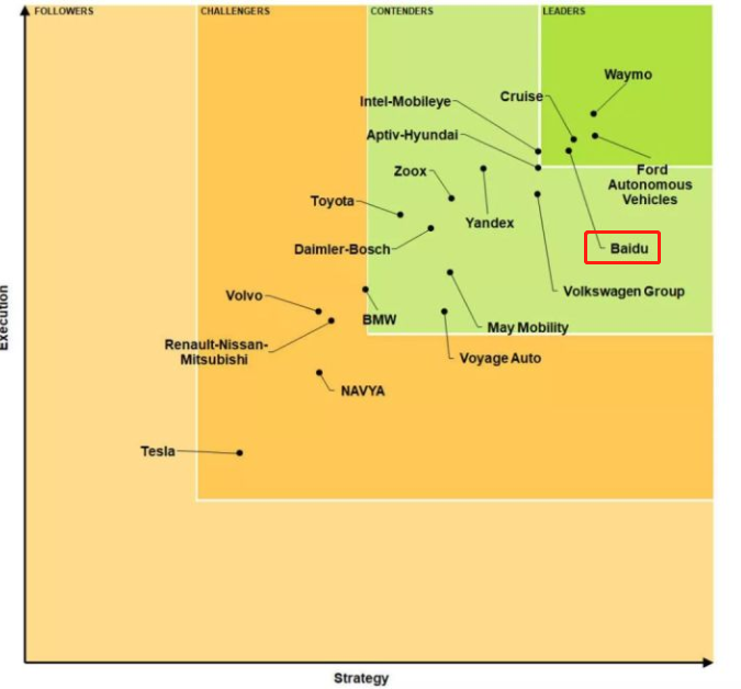另一份来自美国研究公司Navigant Research(简称NR)2020年自动驾驶排行版显示,百度自动驾驶汽车已经杀入行业第一梯队。