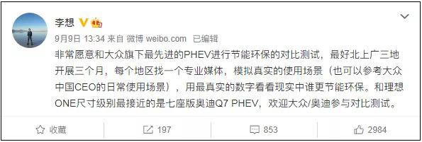 虽然大众中国CE0并没有指名道姓地说就是理想ONE,但理想ONE作为国内现阶段主推增程式动力的产品,不得不让在微博“潜水”三个月的理想CE0李想出来宣战,他说非常愿意和大众集团旗下与理想ONE同级别的PHEV车型(指的是奥迪Q7 PHEV)对比能耗。