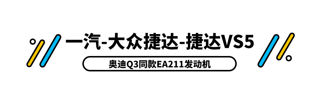其中,捷达VS5就搭载了一款代号EA211-DJS的1.4T发动机,这款发动机在目前大众的中端产品上基本都能见到,例如探歌、探岳。而除了大众品牌外,奥迪Q3也同样搭载了这台1.4T发动机,而捷达VS5和奥迪Q3搭载的发动机在参数以及调校方面都保持了一致,最大功率均为150Ps,并且由于VS5的整车质量要比Q3低200kg,因此也为发动机的动力响应带来了一定帮助。