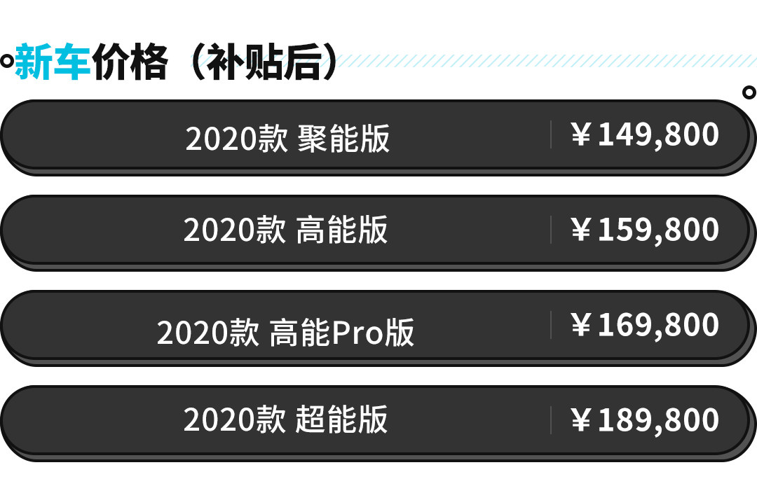 动力层面,全系均为永磁同步电机,采后后置单电机布局。其中聚能版电动机最大功率为120kW,总扭矩250N·m,其它版本的电动机功率则为130kW,扭矩280N·m。电池组容量全系都是70.1kWh,也都有着510km的NEDC工况续航里程。充电速度这块,6慢充需要11-13小时,快充30分钟,则可以从30%充至80%。