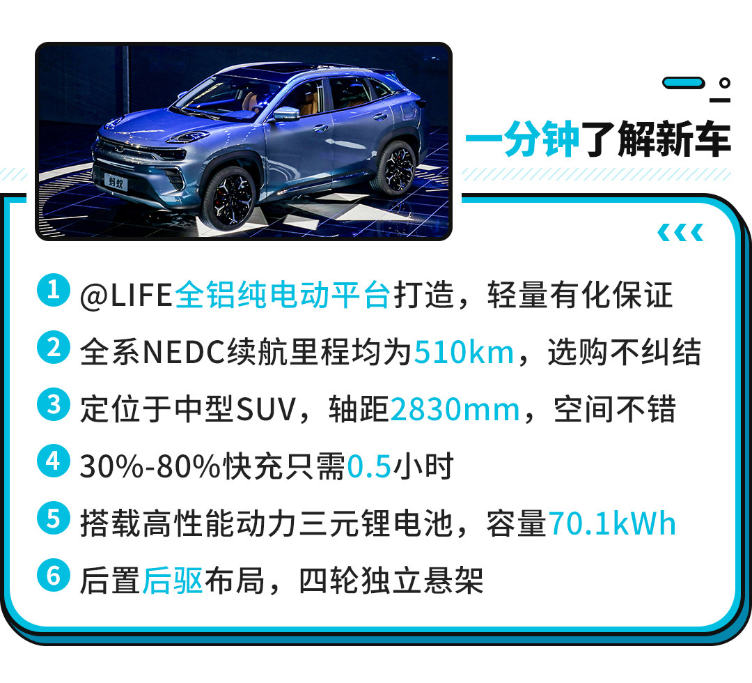 奇瑞蚂蚁是奇瑞新能源@LIFE平台下的首款车型,最值得关注的是该平台为全铝纯电动平台,最显而易见的优势就是有着较为出色的型量化表现。奇瑞蚂蚁的整备为1760kg,这对于一台纯电动中型SUV来说,已经是一个很出色的成绩了,在拥有70.1kWh的电池组的情况下,它甚至比一些同级别燃油车型还要轻,对操控动力以及续航表现都大有脾益。