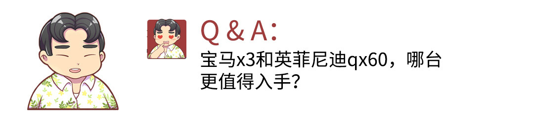 总而言之,虽然英菲尼迪QX60进口豪车、尺寸更大,但在内饰上设计过于老旧,动力性能和操控性也不如宝马X3,所以买买君建议选择宝马X3,除非是你爸买车。