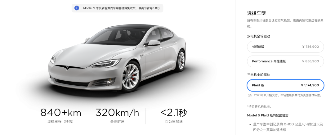 近日,在特斯拉电池日活动上,特斯拉首席执行官埃隆·马斯克宣布Model S Plaid开始接受预订,同日,在特斯拉中国官网上线,新车售价为117.49万元起,预计将于2021年晚些时候交付。相比于普通版本,Plaid车型有着更强的性能,很明显,其对标的车型正是保时捷Taycan。夸张的是,官方给出它的百公里加速时间在2.1s内,并且续航里程将超过820km,极速达到320km/h。Model S Plaid采用三电机布局,系统综合功率超过1100Ps。并且,马斯克还表示,量产版车型的气动表现,相比此前的原型车更强,车轮和制动装置要更大,此外,新车还针对其他细节进行了优化以及升级。
