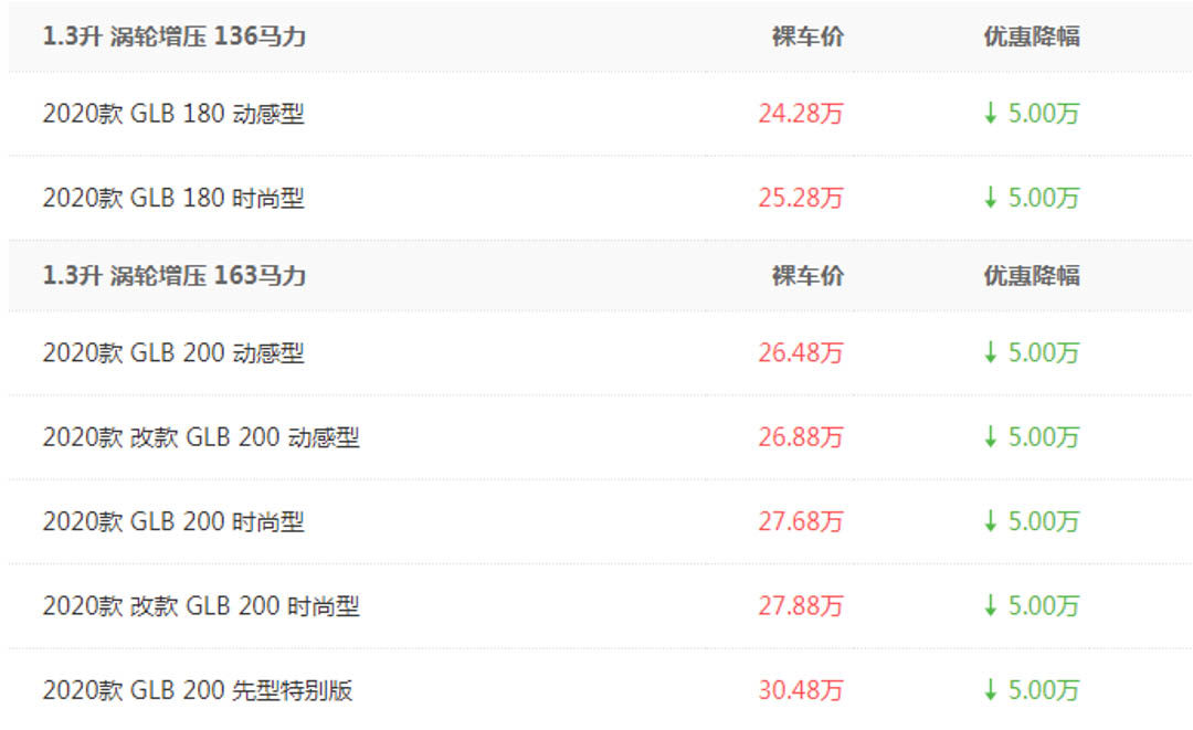 根据经销商处的报价显示,目前奔驰GLB全系均有着5万元的购车优惠,其中低配的GLB 180车型优惠后的裸车价最低仅需24.28万,加上保险、购置税和车船税等费用之后,大约27.3万就能落地!但是小编不推荐购买这个配置,更推荐购买GLB 200 时尚型,首先它的动力表现会更好,其次是很多需要选装的配置都会变成标配,例如车内氛围灯、电动加热的前排座椅等,整体的使用也更加舒适。