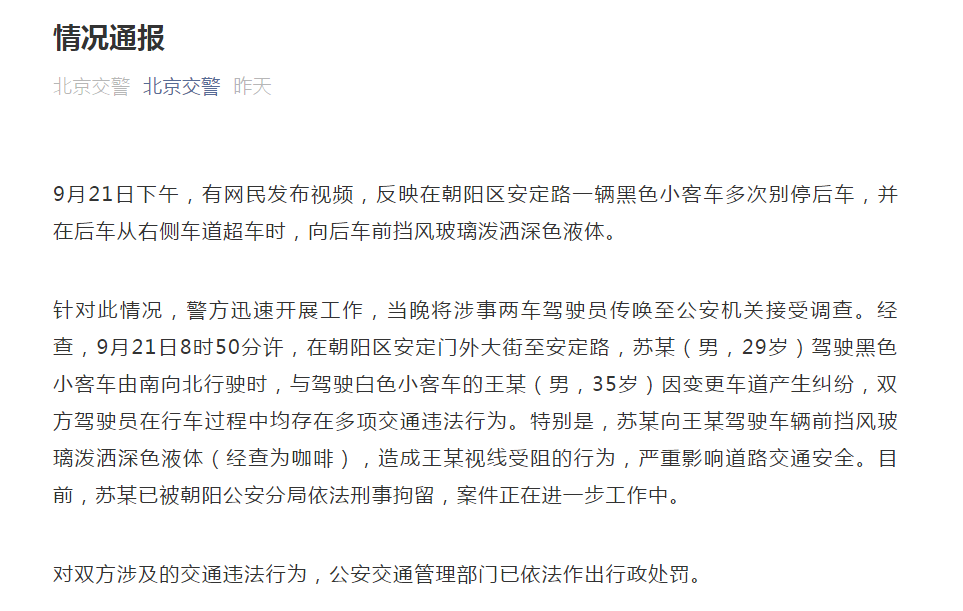 而后针对此事,在9月22日,北京警方发布了情况通报“9月21日下午,有网民发布视频,反映在朝阳区安定路一辆黑色小客车多次别停后车,并在后车从右侧车道超车时,向后车前挡风玻璃泼洒深色液体。针对此情况,警方迅速开展工作,当晚将涉事两车驾驶员传唤至公安机关接受调查。经查,9月21日8时50分许,在朝阳区安定门外大街至安定路,苏某(男,29岁)驾驶黑色小客车由南向北行驶时,与驾驶白色小客车的王某(男,35岁)因变更车道产生纠纷,双方驾驶员在行车过程中均存在多项交通违法行为。