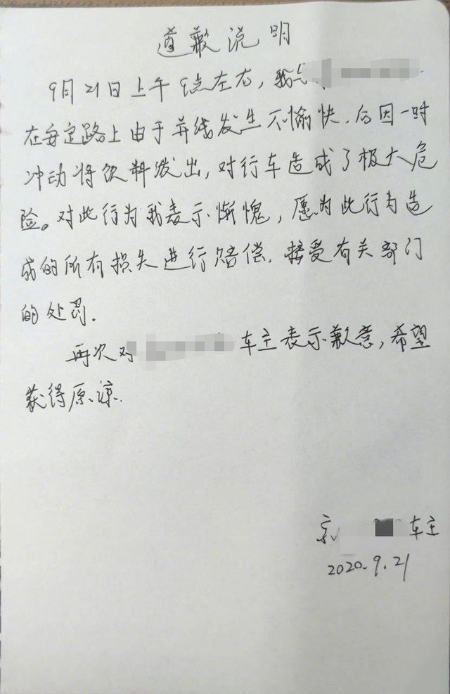 视频一经流出便在网络上疯传,在网络力量的“加持下”,当晚6时许,就有网友贴出一张自称是黑色轿车车主手写的道歉信,黑色轿车车主对早上的“恶意”行为深感歉意,并愿意为自己的行为负责,接受有关部门的处罚,希望可以获得视频拍摄车主的原谅。