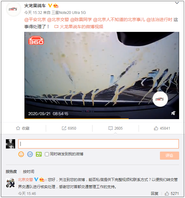 而在当天下午北京交警就给最早发布视频的微博网友留言:“您好,关注到您的微博,能否私信提供下完整视频和联系方式?以便我们转交管界交通队进行核实处理,感谢您对首都交通管理工作的支持。”