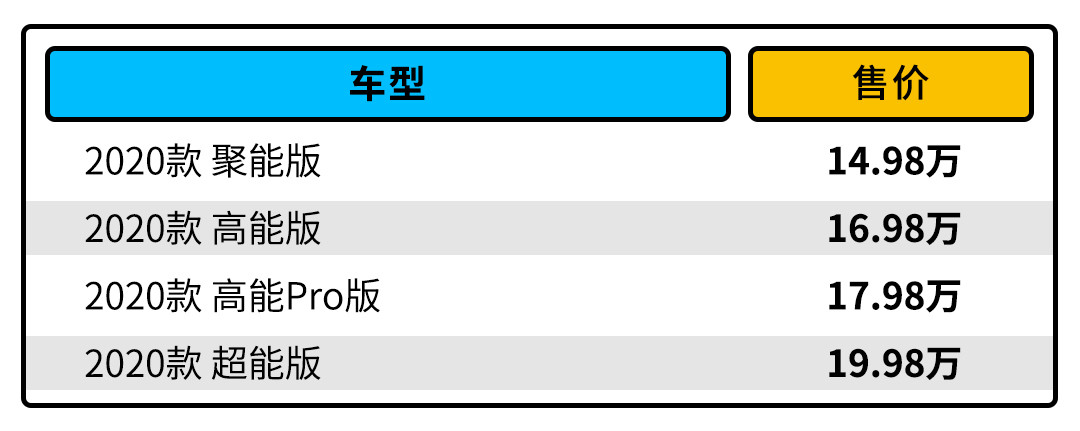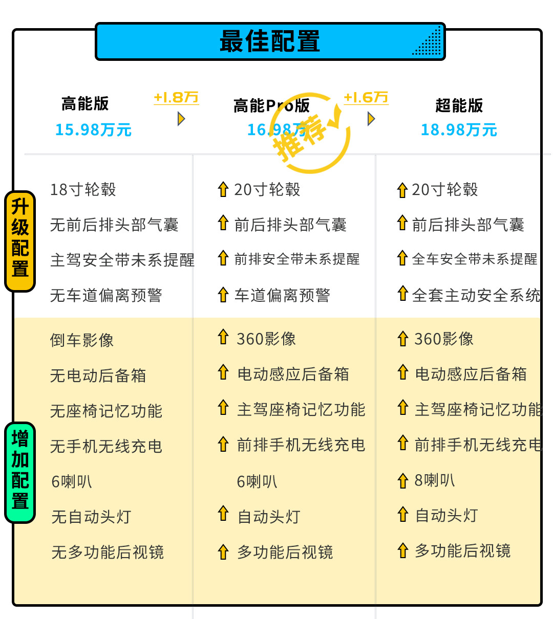 可以看出,售价16.98万元的高能Pro版在配置和定价上有着最合适的平衡,比只贵了一万元的高能版多出了十数项功能,而又只比贵了2万元的顶配车型少了一套主动安全系统,以及不足挂齿的几项舒适性配置,所以最值得购买的车型显然就是高能Pro版。再加上其为新能源车型的身份,有着免购置税的特权,也就是说目前高能Pro版车型的落地价在17.4万元左右。