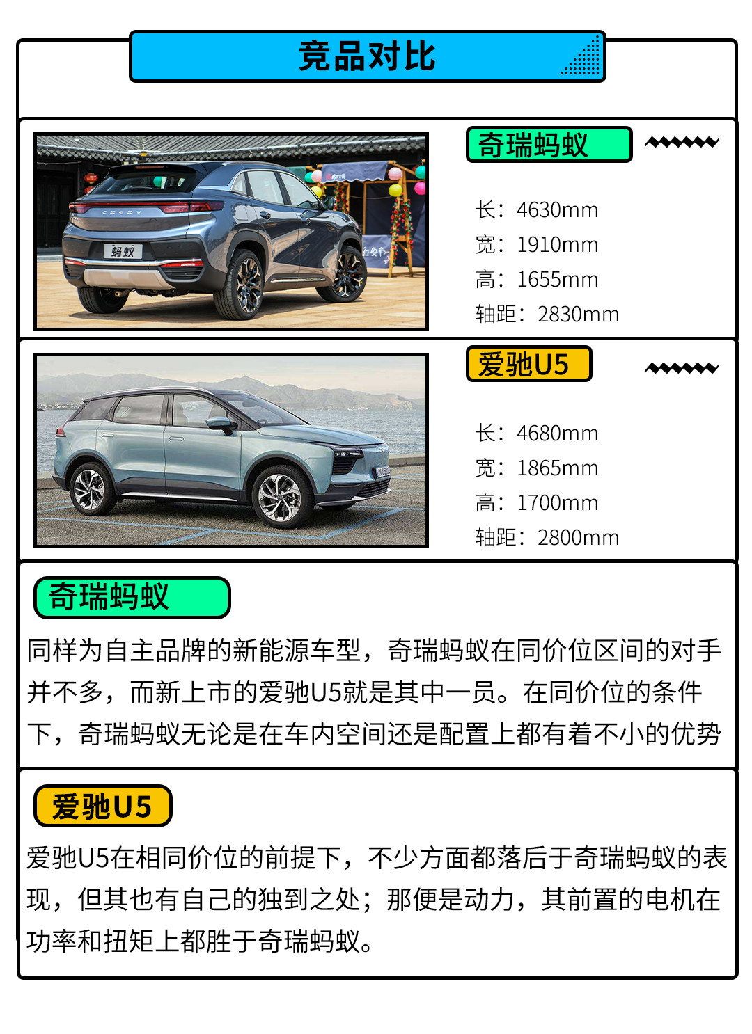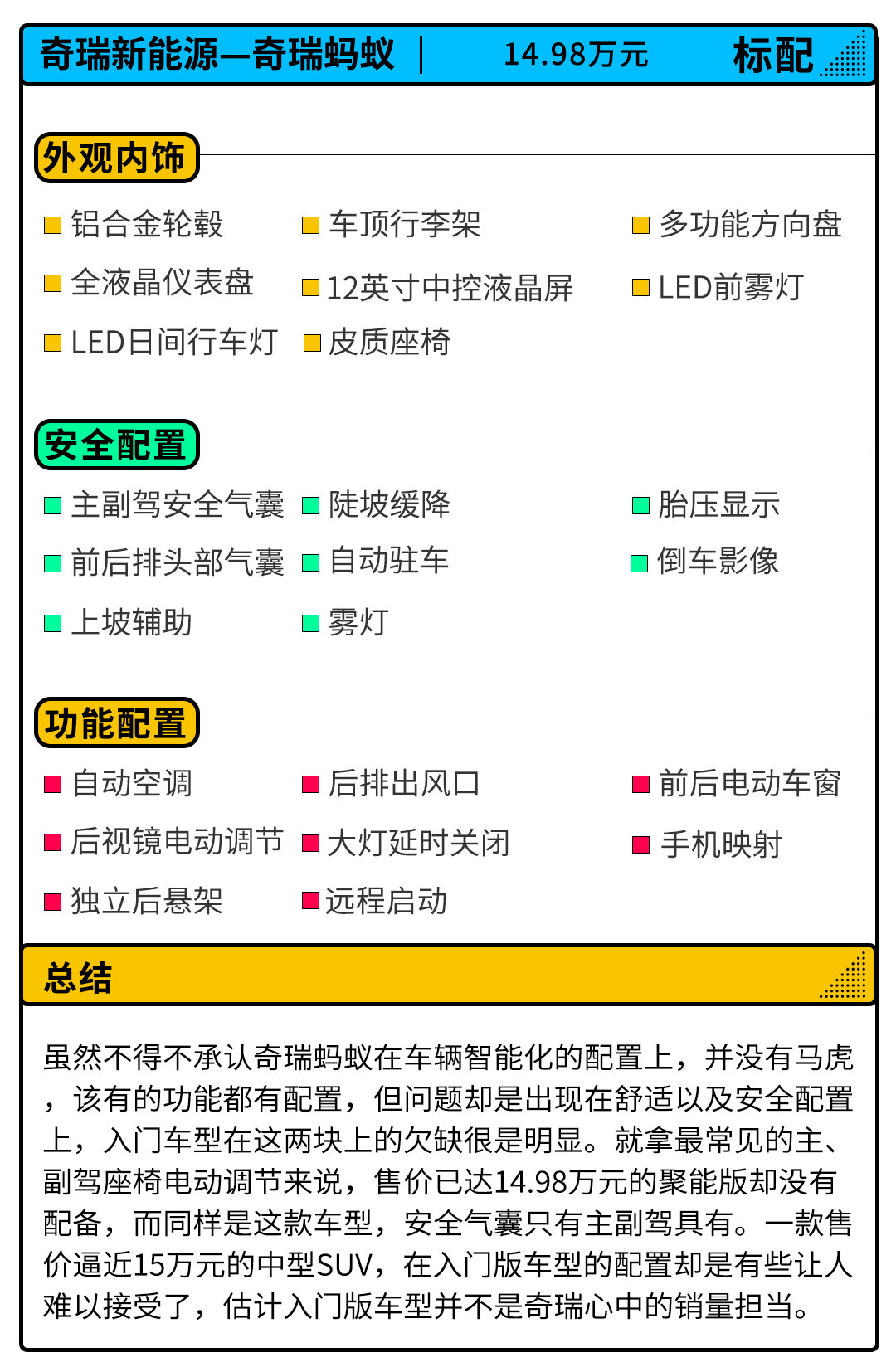 在相同售价的前提下,奇瑞蚂蚁的车型在配置和续航上有着明显的优势,而这个价位的纯电动中型SUV本来就没有太多的的选择,所以说奇瑞蚂蚁在综合实力方面还是有着不少可以肯定的点。