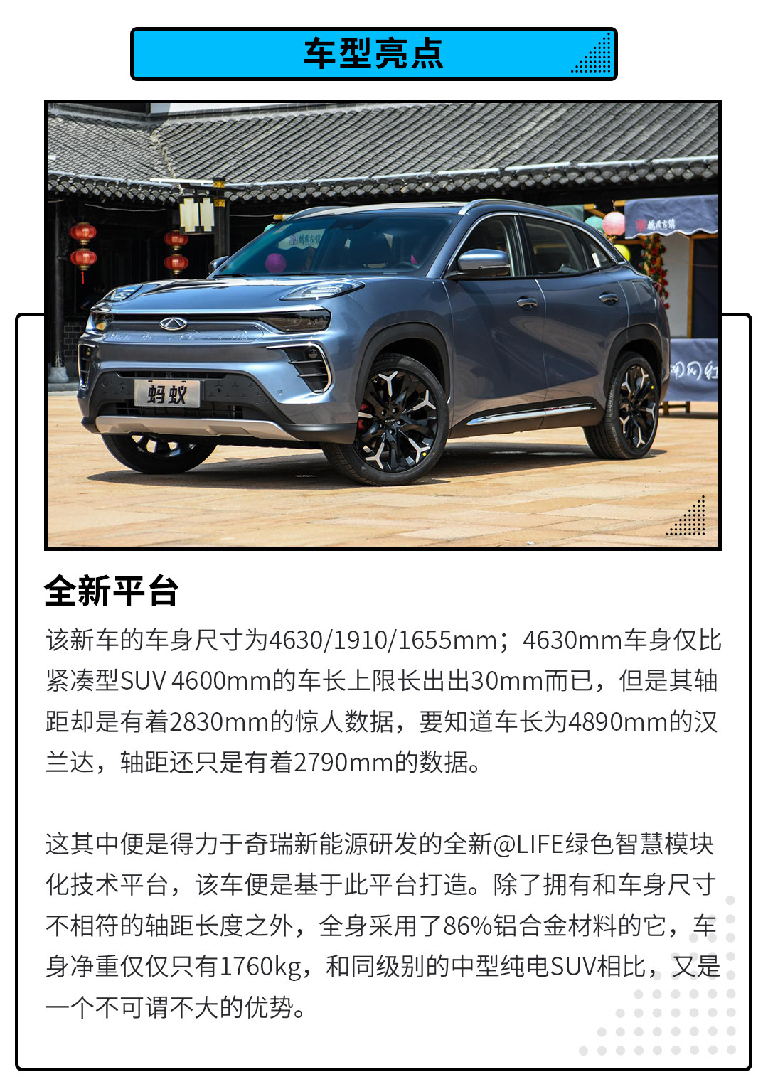 不过要是有SUV的尺寸只比紧凑型SUV稍大,但是却有着中型SUV的轴距呢?这样会不会在保证车身灵活性的同时,也能提供相当阔绰的车内空间呢?日前,奇瑞就推出了一款这样很有看点的中型SUV,便是上图所示的奇瑞新能源—奇瑞蚂蚁。