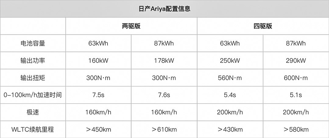 除此以外,为降低购买门槛,日产Ariya还配备了单电机前驱版本车型,能输出160kW/178kW、300N·m,车辆极速被限制在160km/h。